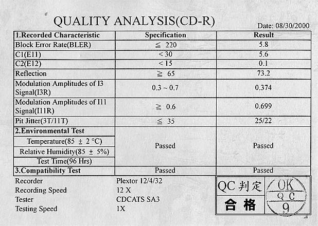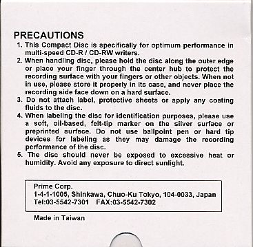 2001.01.14 ATIP: 97m 26s 06f Disc Manufacturer: Fornet International Pte Ltd. Assumed Dye type: Phthalocyanine (Type 6) Media type: CD-Recordable Recording Speeds: min. unknown - max. unknown nominal Capacity: 657.18MB (74m 48s 25f / LBA: 336475) |