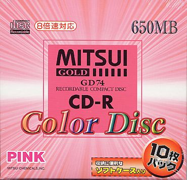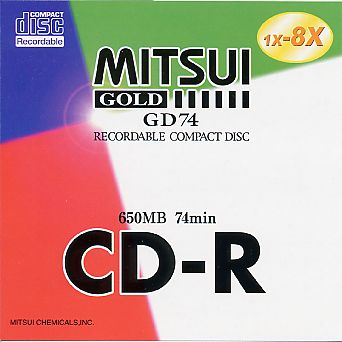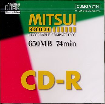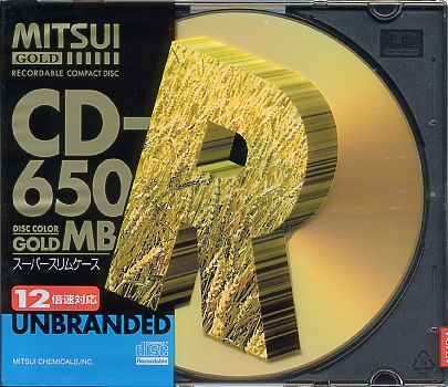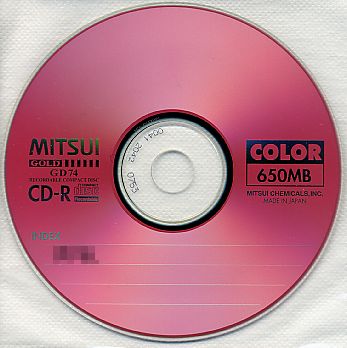 型式全く不明。下記のCDRG74UGのゴールドUNBRANDEDと比較すると、中心部に"MITSUI CD-R"と記載されているのが大きな違い。 拾い物。 |